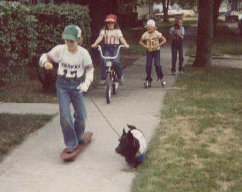 ![]() I'm sure this made sense at the time, but I cannot for the life of me figure out just what we are doing. Obviously, it was important that we all wear football jerseys, including the dog. I am riding the skateboard. My sister Paula is on the bike. Our cousin Jeanna is on the skates and I'm not sure what her sister Terra is doing in the background.