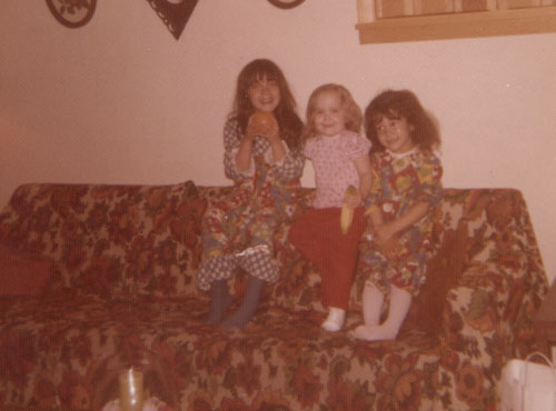 Me (middle) and my cousins Maria (L) and Jennifer (R) in our 70's-furnture pattern camoflage.